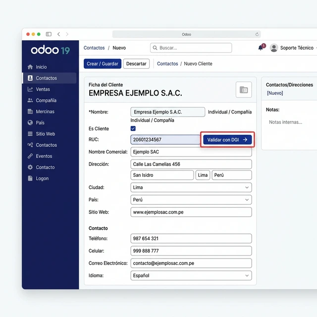 La Factura exige perfección. Odoo no permite avanzar a una cotización si el contacto no está validado con la DGI. El ecosistema protege la integridad de tu facturación desde el minuto uno.