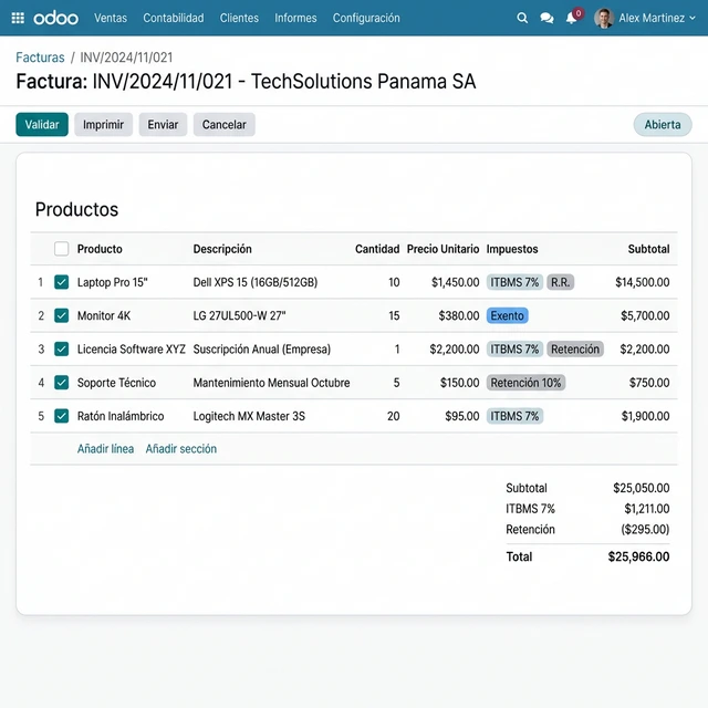 ¿Clientes exentos? ¿Retenciones de ITBMS? Odoo reconoce el perfil del cliente y aplica las reglas fiscales de Panamá al instante. Tú solo vendes, el sistema calcula y controla por ti.