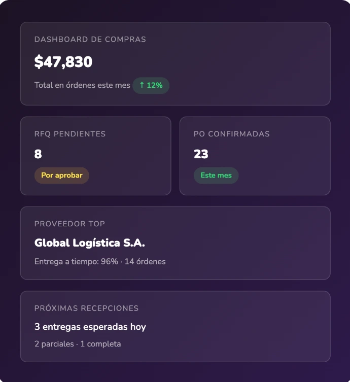 Cree, apruebe y envíe órdenes de compra en minutos. Gestione múltiples proveedores, divisas y términos de pago desde una sola pantalla.